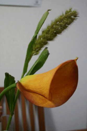 今日の花大臣のチョイスはカラー。マンゴー色が可愛い。後ろの犬のしっぽのようなものはなんと「粟(あわ)」の穂。お店で気になるそぶりを見せてたらサービスでくれた。昔米のなかったときに粟とか稗とか食べてたって聞いたけど、これがその粟かと感動。食…